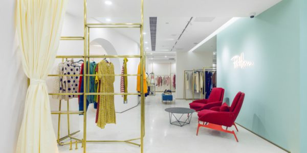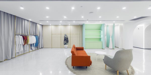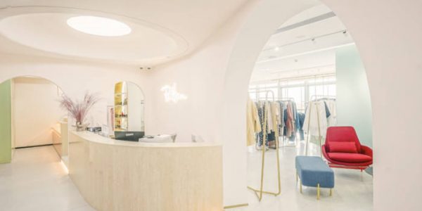 The arched shape of each letter of the brand name “Ruhnn” are subtly incorporated into the design of those partitions, which perfectly blends the brand’s visual identity into the space, makes the space animated and endows it with a sense of layering.
