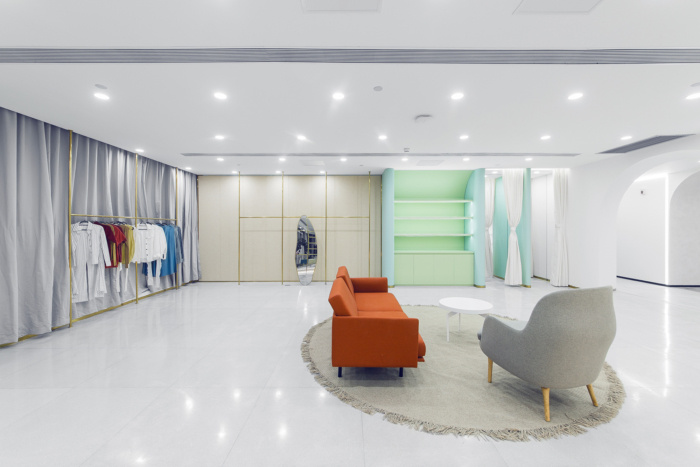 The attribute of Ruhnn Culture determines that its workspace needs to accommodate multiple functions and areas for display clothing and products need to be created in the limited space. Considering this, inDeco tried to figure out more possibilities, and ingeniously utilized the corridor space outside live stream rooms and photography studios. The walls along the corridors are used for displaying products, which enriches visual experiences in the long skinny area.