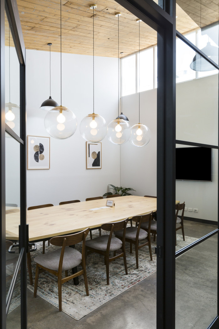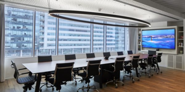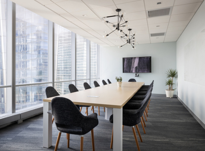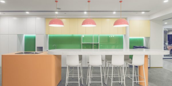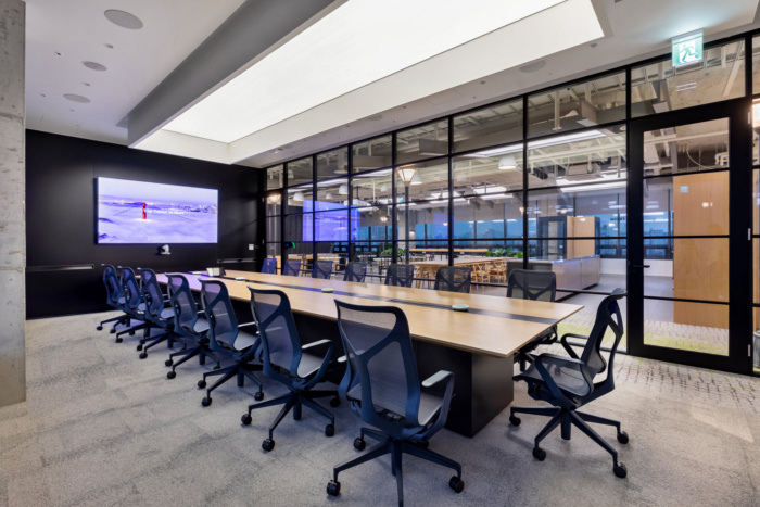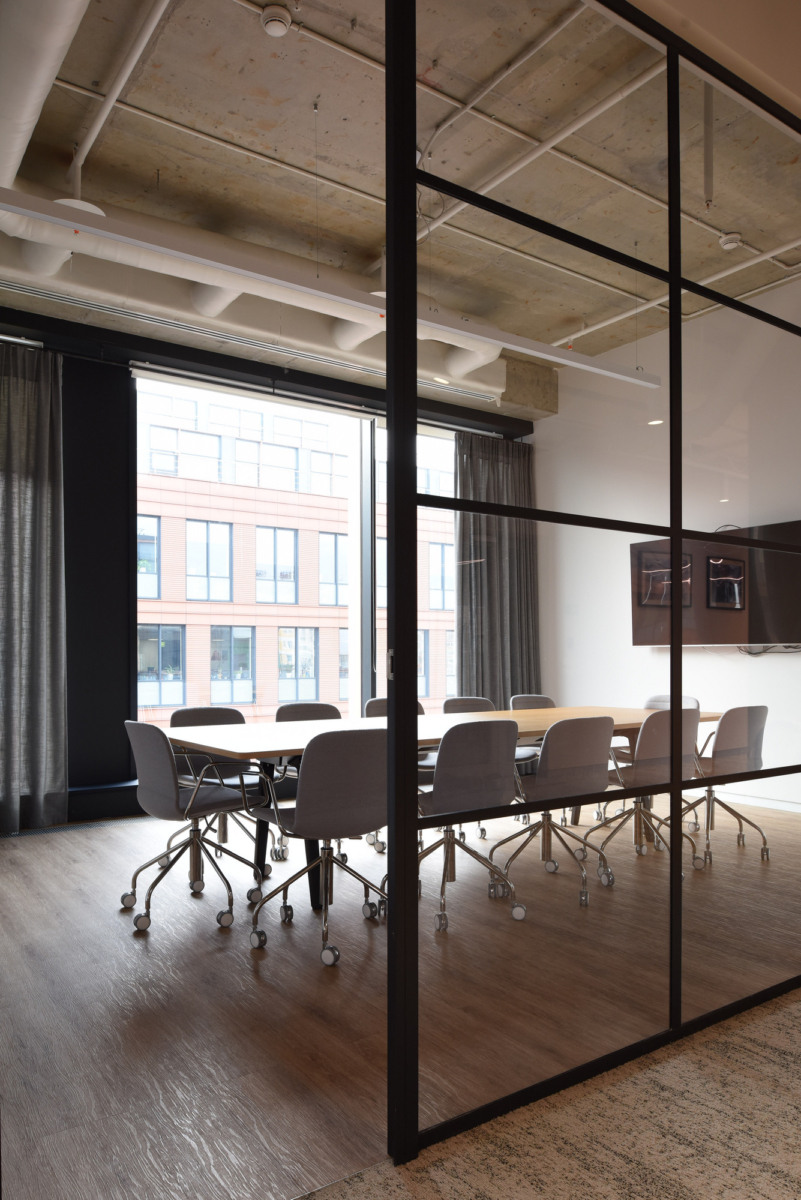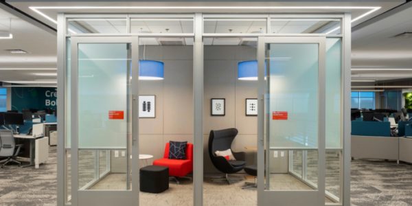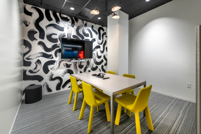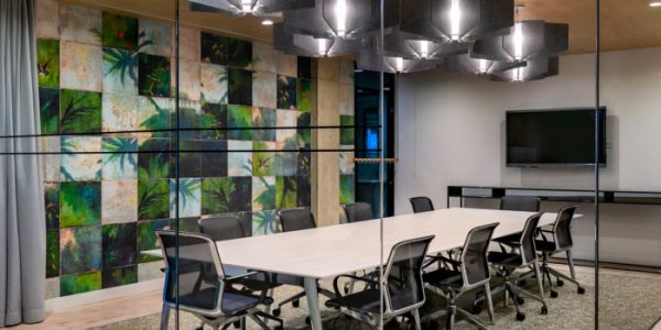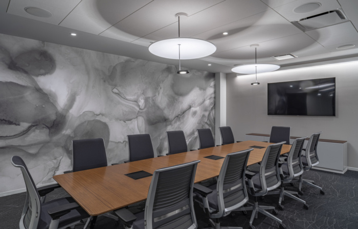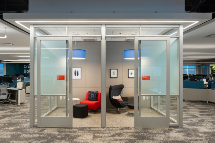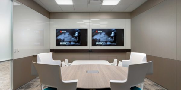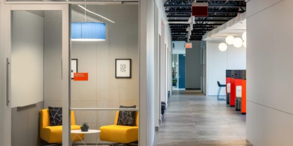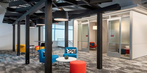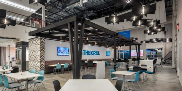 With a resimercial (residential and commercial) aesthetic woven with subtle elements of biophilic design, Zovio’s new headquarters looks less like a corporate office and more like an exciting place to work, socialize and live. One employee is quoted as saying, “the space is breathtaking”. The first floor totals 80,000 SF and the mezzanine 50,000 SF. This center houses an exterior patio, stadium seating for town halls, a health clinic, fitness center, and full-service cafe. Technology meets creativity with DIRTT modular walls, acoustic panels and white noise systems that strategically eliminate sound overlap.