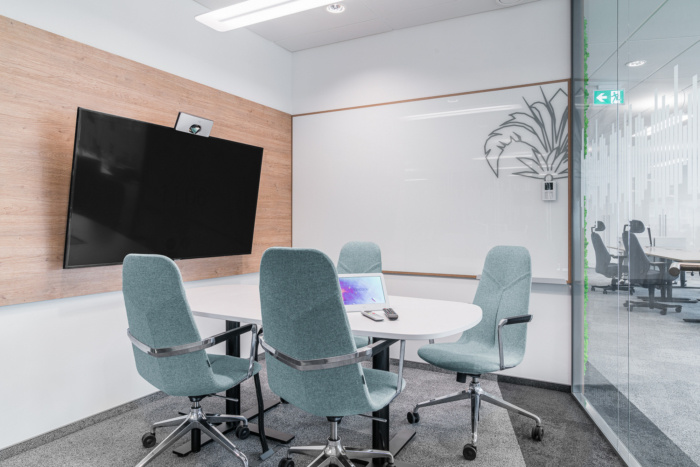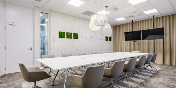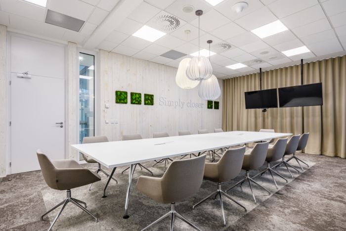 The space was designed in the modern Scandinavian style – with an emphasis on simplicity, minimalism and well thought-out functionality. Interiors are the combination of whites, soft felt, natural wood, vivid greens and colors referring to the natural values of the northern countries. Deliberate materials combinations create a light and spacious office, positively influencing the well-being and efficiency of the 47 employees.