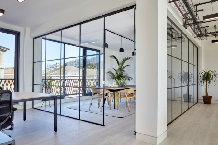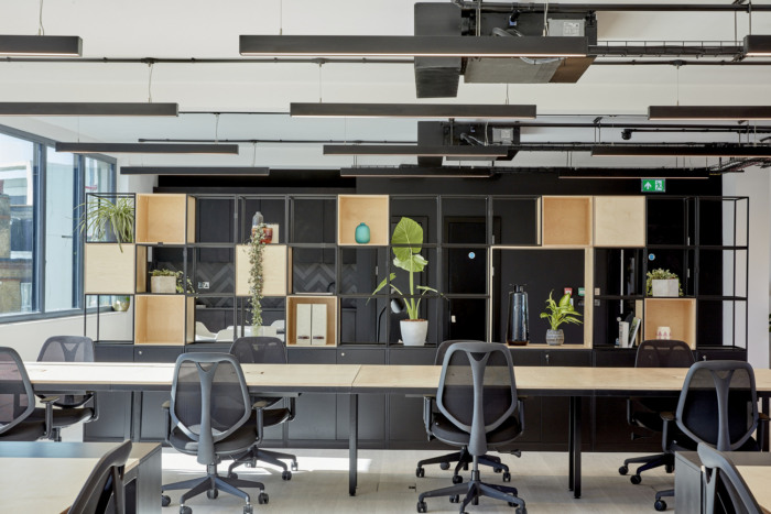 Internally, glazed meeting rooms and full-height windows create bright naturally lit workspaces, offset with a tonal palette inspired by aged industrial materials such as Verdigris and rust. Base materials of concrete, metal and timber, combined with exposed services and lighting, continue the industrial aesthetic. Soft furnishings in muted colours and natural greenery add a layer of domesticity and encourage social interaction. Cycle spaces and showers are provided for building users.