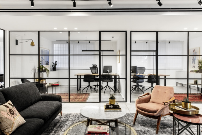 Contemporary light fixtures, vintage carpets, cotton drapes, local modern art photography over the walls, plants, books and accessories complement the family, home style atmosphere at this Tel Aviv central offices.