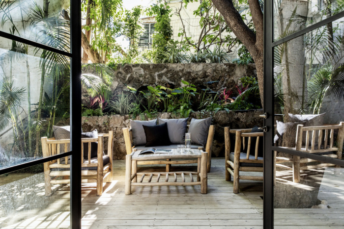 The backyard, accessed from the conference room, was completely renovated, with hardwood deck, rich vegetation, and an outdoor lounge with wood and textile garden furniture to complete the homestyle garden vibe.