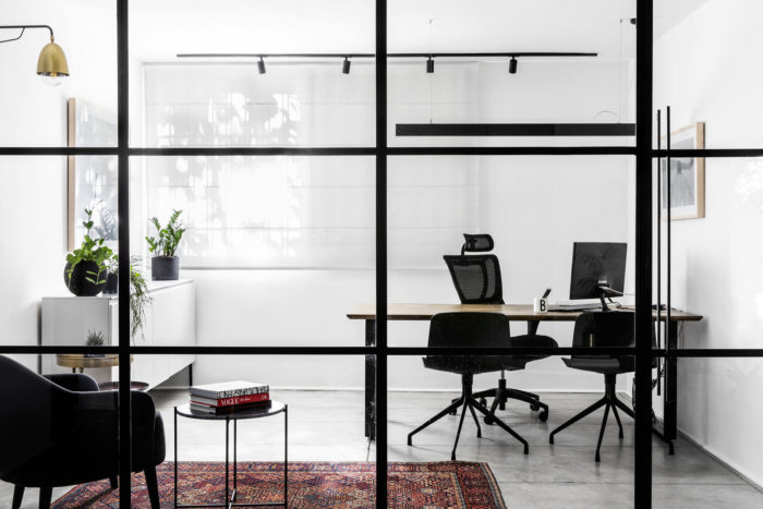 The space was divided using steel frame and glass partitions. Natural concrete floor in the offices and lounge, with a fishbone wood parquet in the conference room. Furniture is a mixture of custom designed steel furniture and carefully selected new home furniture.