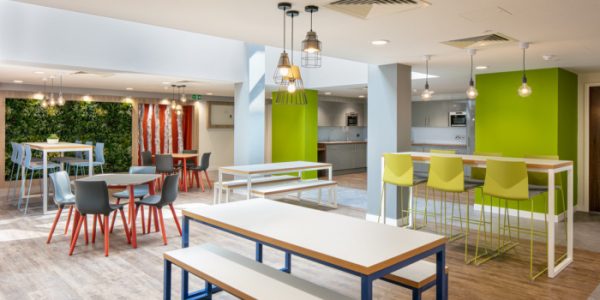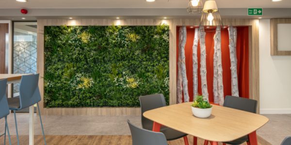 The ground floor houses a large, multifunction space, directly under the glass atrium. The Opus 4 design team embraced many current workplace trends, with biophilic design elements, such as natural finishes to flooring and several nature walls combining silver birch tree bark with an array of mixed foliage. The space also has a mix of seating styles for people to meet, dine and work individually or in clusters. There is an eclectic mix of decorative styles to the walls, with painted finishes, vinyl wallcovering and bespoke 3D wall panelling. The rest of the ground floor houses departmental offices, a large boardroom, management offices, a family room, a large kitchen and shower wet rooms and toilets.