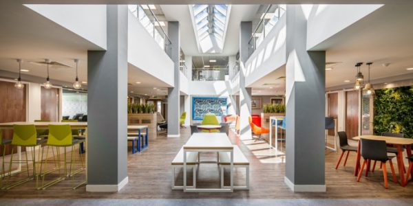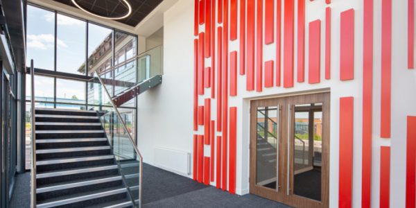 The existing structure was significantly enhanced with insulated, powder-coated cladding and a new roof was installed, with a glazed feature atrium, running through the central core of the building. This was key, architectural design feature which allowed natural light to cascade through the first-floor office areas to the open plan multifunction space on the ground floor. A glazed curtain walling system was fitted to the front of the building and the external areas re-landscaped.
