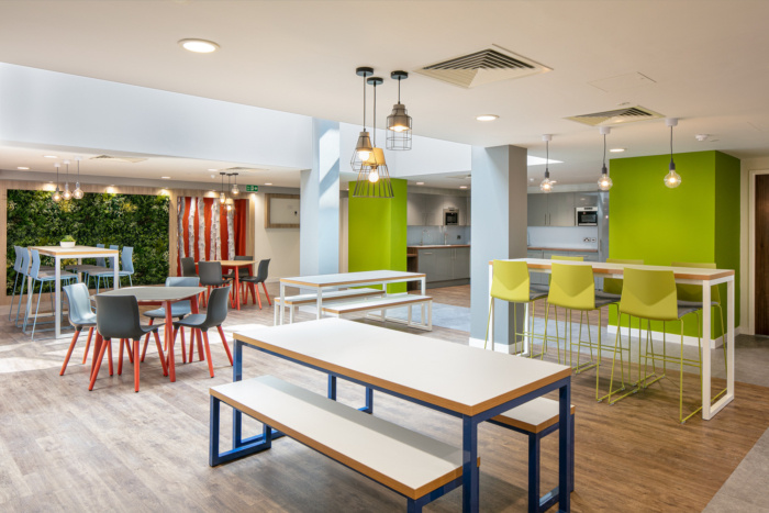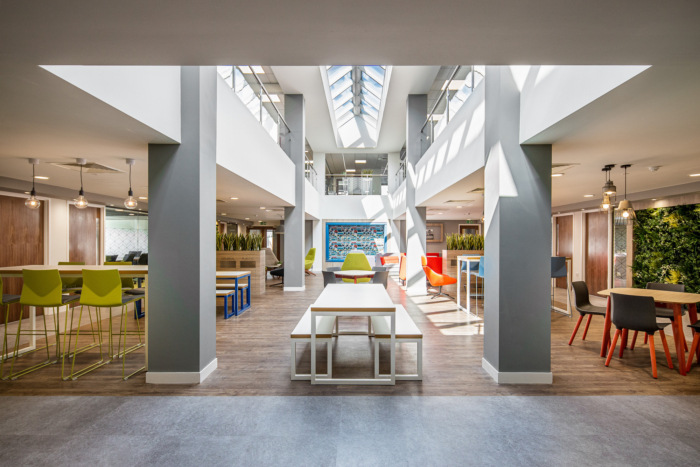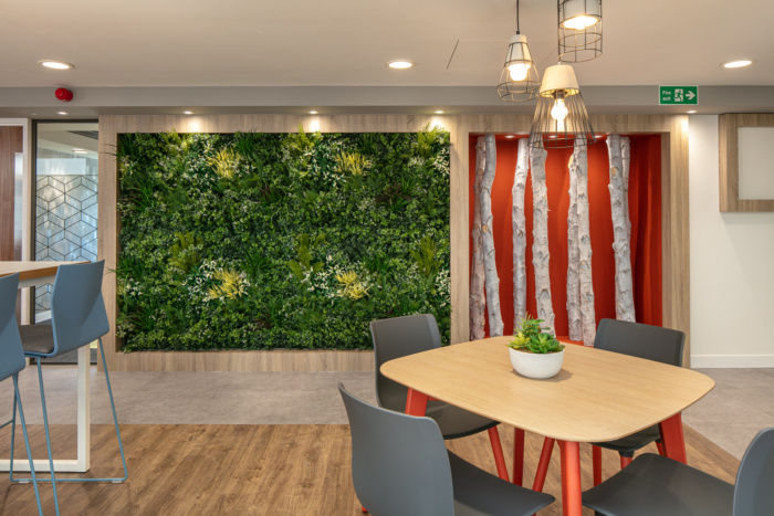 The ground floor houses a large, multifunction space, directly under the glass atrium. The Opus 4 design team embraced many current workplace trends, with biophilic design elements, such as natural finishes to flooring and several nature walls combining silver birch tree bark with an array of mixed foliage. The space also has a mix of seating styles for people to meet, dine and work individually or in clusters. There is an eclectic mix of decorative styles to the walls, with painted finishes, vinyl wallcovering and bespoke 3D wall panelling. The rest of the ground floor houses departmental offices, a large boardroom, management offices, a family room, a large kitchen and shower wet rooms and toilets.