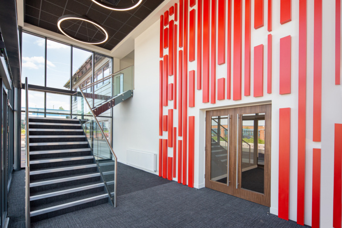 The existing structure was significantly enhanced with insulated, powder-coated cladding and a new roof was installed, with a glazed feature atrium, running through the central core of the building. This was key, architectural design feature which allowed natural light to cascade through the first-floor office areas to the open plan multifunction space on the ground floor. A glazed curtain walling system was fitted to the front of the building and the external areas re-landscaped.