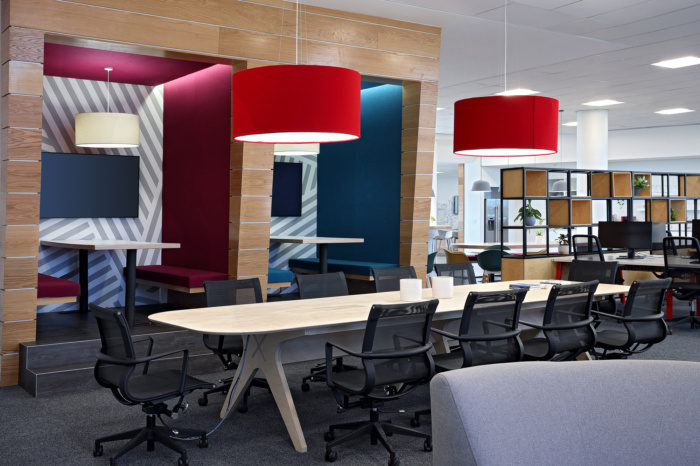 The desking itself is bold, some with red steel frames, for a visually interesting effect. Meeting booths and wall designs bring in more colour, creating an interior palette which, when looked at as a whole, is a myriad of tones that all speak to the brand, its global messaging and local flavour.