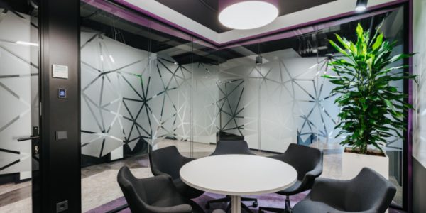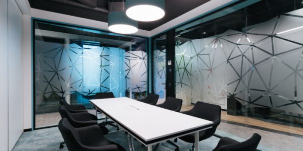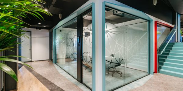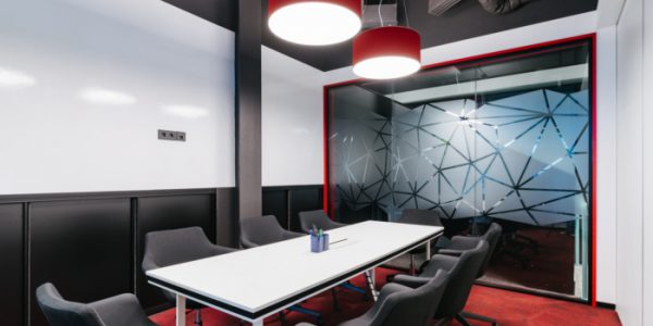 Every meeting room has its dedicated color, which is reflected in the glass partitions frame, flooring and light fittings color.
