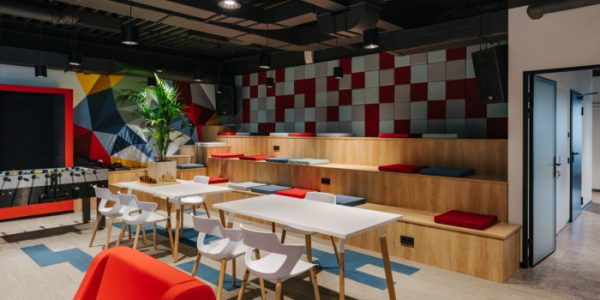 The central core of the office is a communal area, split with a corridor into a stand-up area and a kitchen. The stand-up area has an event amphitheater, a gaming area and a recreation area. The kitchen consists of a kitchen cabinetry, shed-styled sofa booths and a group of dining tables with chairs. Zones are stylistically linked with each other by repetition of the wood textures and colors.