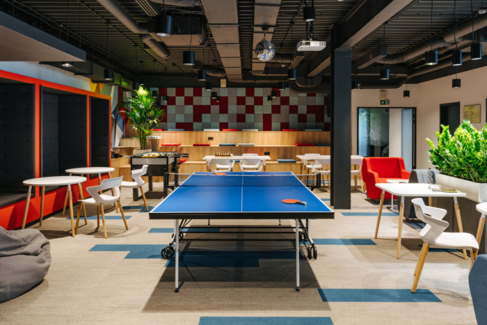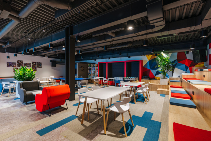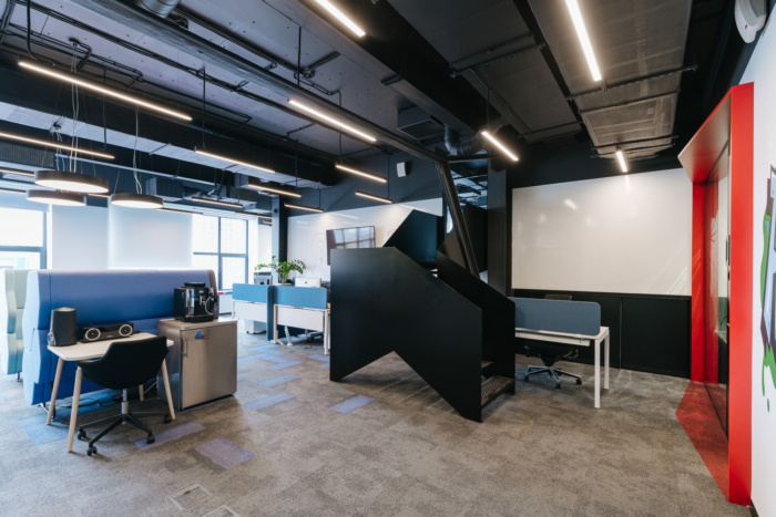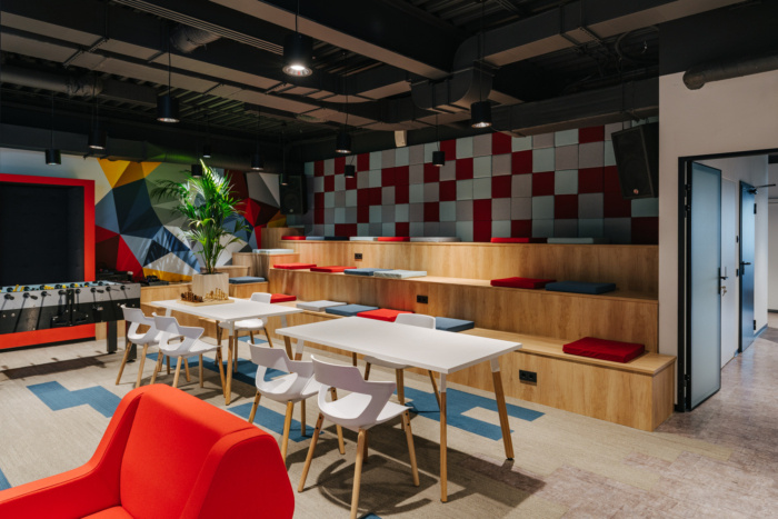 The central core of the office is a communal area, split with a corridor into a stand-up area and a kitchen. The stand-up area has an event amphitheater, a gaming area and a recreation area. The kitchen consists of a kitchen cabinetry, shed-styled sofa booths and a group of dining tables with chairs. Zones are stylistically linked with each other by repetition of the wood textures and colors.