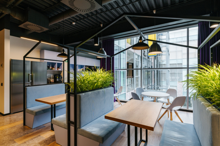 The work area is separated into functional group offices, with the recreational area sitting in the center of the space. Some offices are equipped with bespoke bench along facade – that not only provides a place for chat and rest but also offers a rather spacious storage. At the same time, the bench reduces the effect of a highly placed windows typical for industrial buildings.