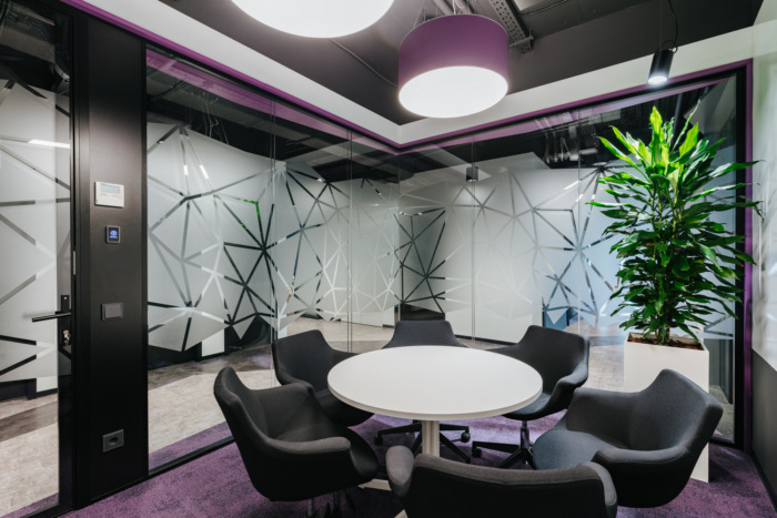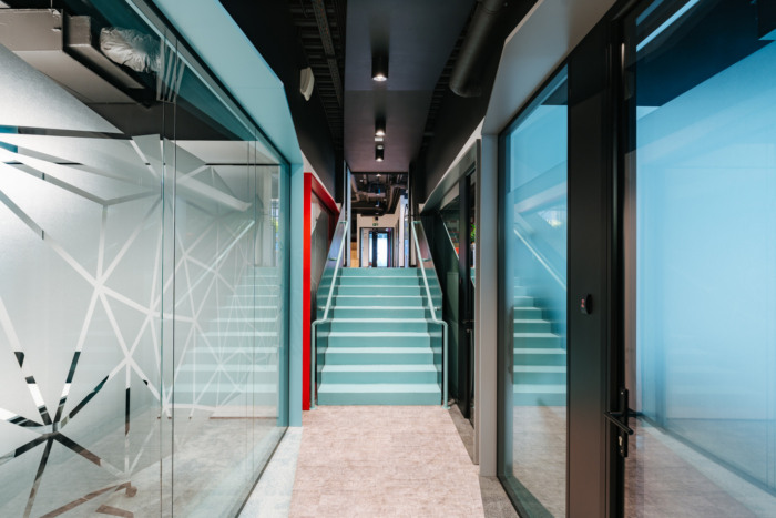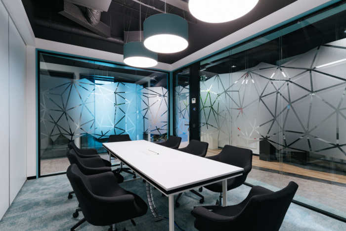 Every meeting room has its dedicated color, which is reflected in the glass partitions frame, flooring and light fittings color.