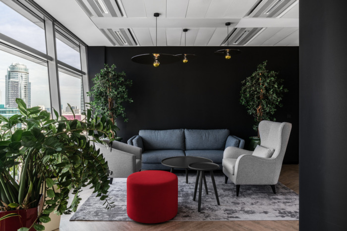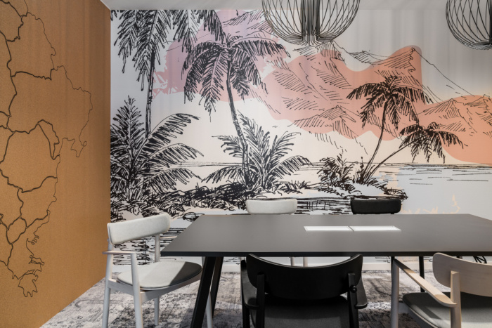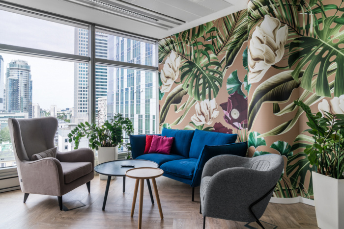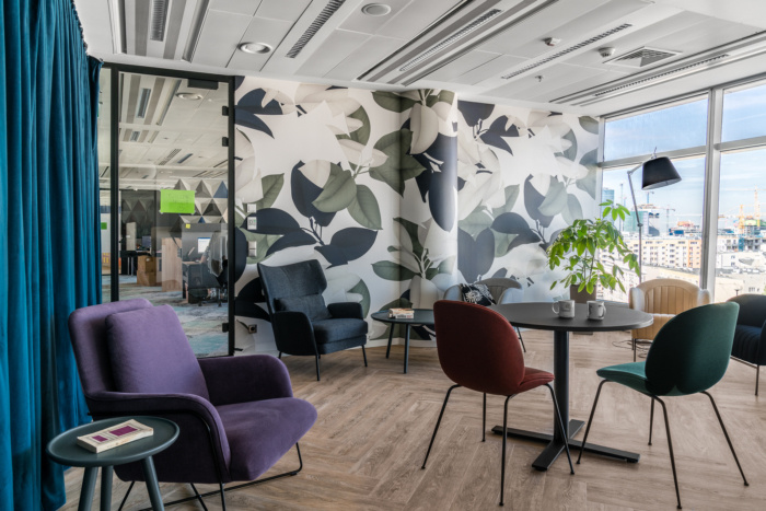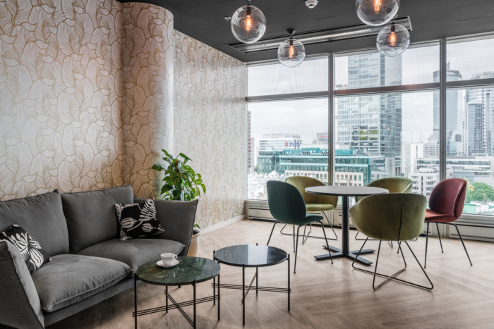Although both offices are separate units with different teams, in their style there are more common points than differences. The general aesthetics are very similar, and e.g. kitchens are almost identical – with creamy fronts, sinter quartz on countertops, bright lamps and characteristic graphics on fronts and walls. Such meeting and integration venues are a very important part of the office. Coffee points are conducive to spontaneous meetings and conversations in casual circumstances. And a chillout room is a place where you can relax and for a moment, calm down on a comfortable sofa, away from the office hustle and bustle.