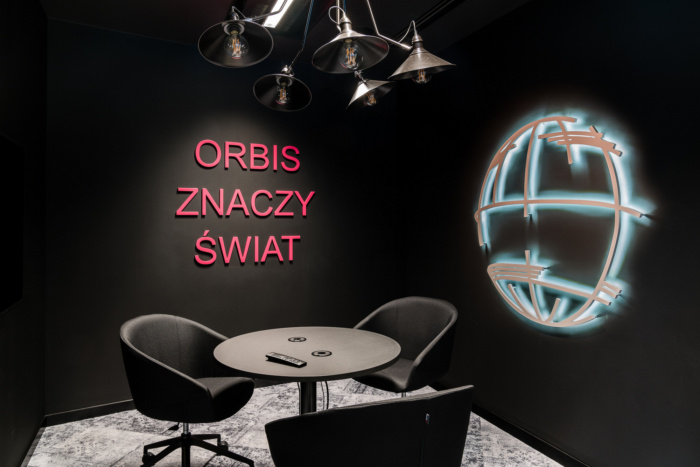 Each room is decorated in a different style – unconventional aesthetics and solutions stimulate creativity and original ideas. In the room called Slim&Fit you can sit on balls and there are wallbars. In the Globus hall, the neon sign on the wall draws attention – it is a reference to the Orbis company’s symbol, and the dark color scheme is conducive to concentration. There are also separate rooms in which we learn about the history, ambitions and rules of the network (Orbis History, Map, Planet 21 or Heartist) – this reminds us of creating solutions consistent with the company’s values. Brain Fitness conference room is filled with board games and elements stimulating interaction and intellectual competition, which makes it an ideal place to relax and look for unconventional ideas. The Illusion Room, on the other hand, is an area where the sense of sight is deceived – it allows one to avoid patterns in thinking and acting,” says The Design Group.